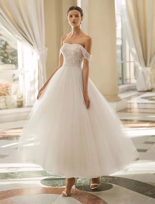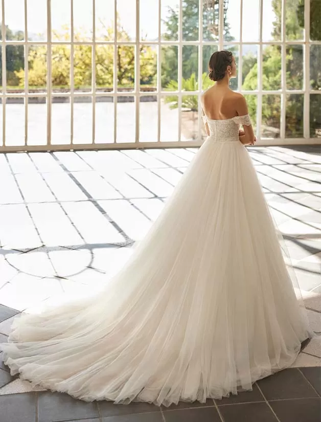 Le spose che sognano un abito principessa per il loro matrimonio non potranno resistere al fascino di Amory. Un modello con scollo senza spalline e gonna in tulle molto romantica con lungo strascico. Ideale per una cerimonia civile in primavera.