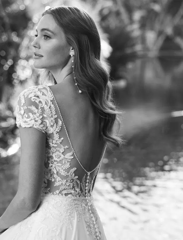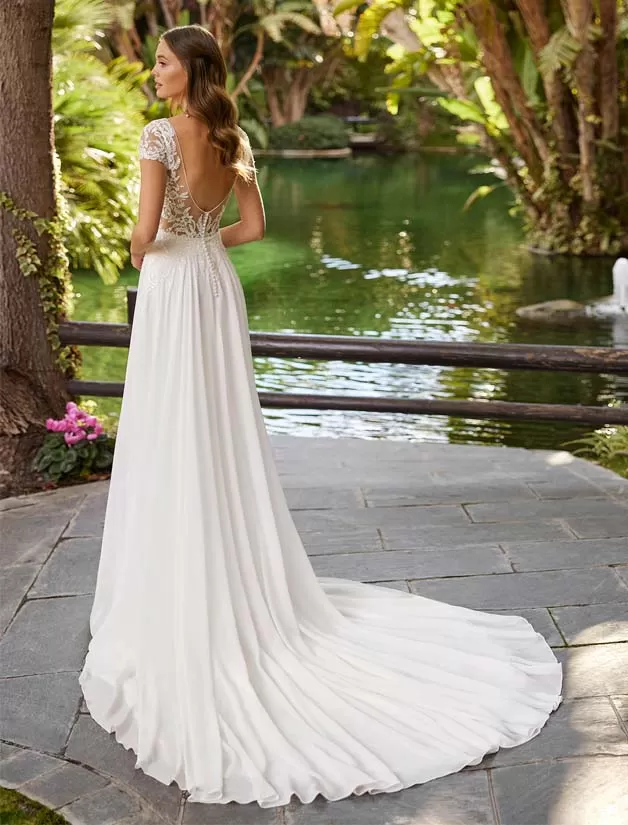 Abito da sposa stile principessa, realizzato in georgette abbinata a pizzi impreziositi da perline; con una sovrapposizione di illusione su uno scollo a cuore, una schiena effetto tatuaggio con dettaglio di bottoni e maniche corte. Delicato design Adriana Alier.