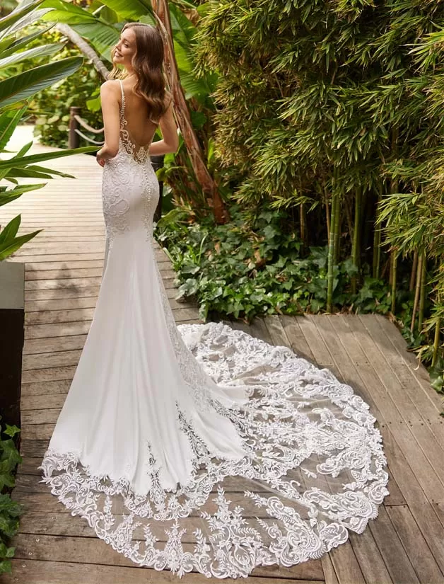 Sexy abito da sposa a sirena, realizzato in crêpe stretch abbinato a pizzo impreziosito da perline e strascico con rifiniture in pizzo; con scollo profondo e schiena trasparente trasparente con dettaglio di bottoni. Look unico di Adriana Alier.
