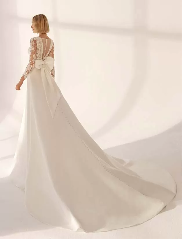 Abito da sposa con gonna redingote in stile classico, confezionato in pizzo con passamaneria a onda di strass e gonna in Amalfi; scollo a V sul davanti e sulla schiena con onde incrociate e tulle effetto illusione; ampia fusciacca in Amalfi e maniche lunghe in pizzo Abito Aire Atelier Esclusivo di alta moda.