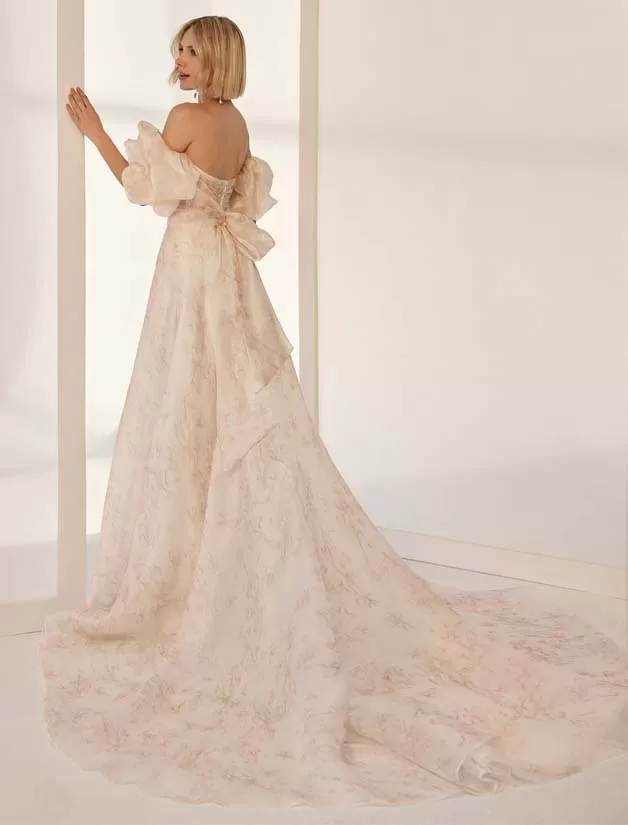 Abito da sposa redingote confezionato in organza stampata; con corpetto drappeggiato senza spalline, manicotti a palloncino rimovibili e grande fiocco irregolare come ornamento sulla spalla. Modello di Aire Atelier di alta moda.