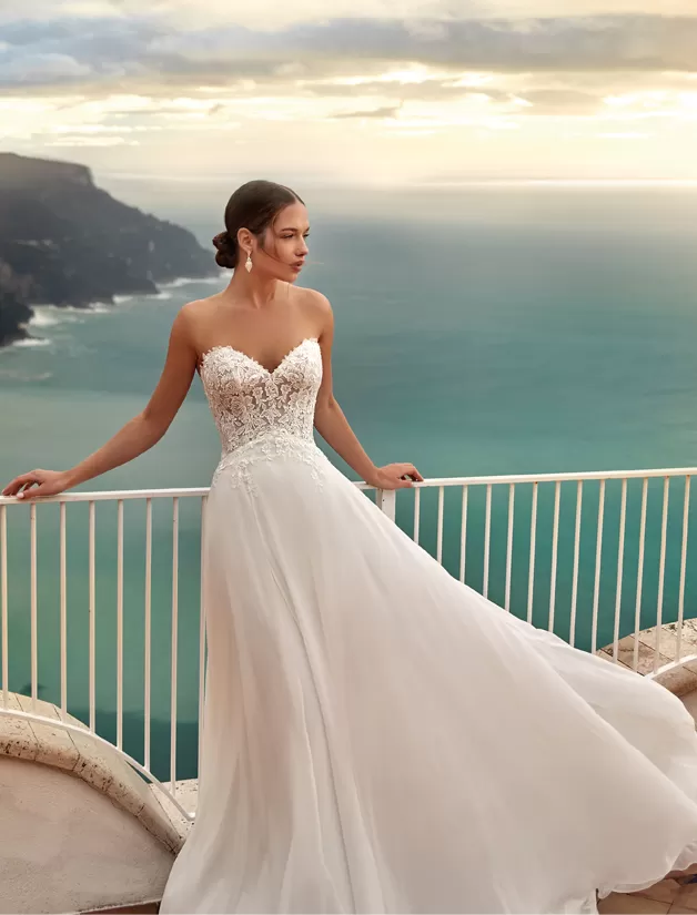 Romantico abito da sposa scivolato in raso off white e corpino di pizzo smanicato con scollo a cuore. La cappa in pizzo con maniche lunghe rende perfetto questo look per la cerimonia e la sera.