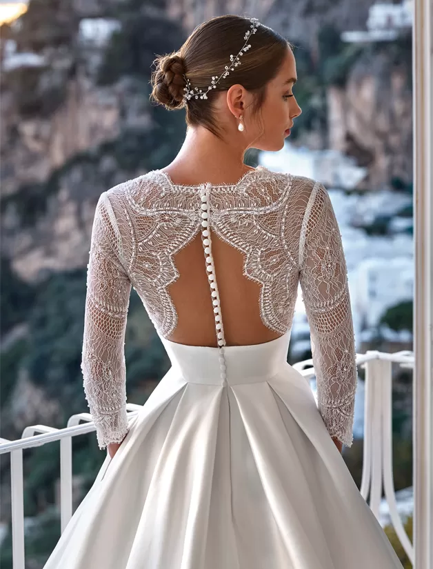 Per la sposa che sogna un abito da principessa moderna: modello con gonna principesca in mikado e un delizioso corpino di pizzo con maniche lunghe. Sulla schiena un delicato gioco di trasparenze e bottoncini a vista completano il tuo look dei sogni!