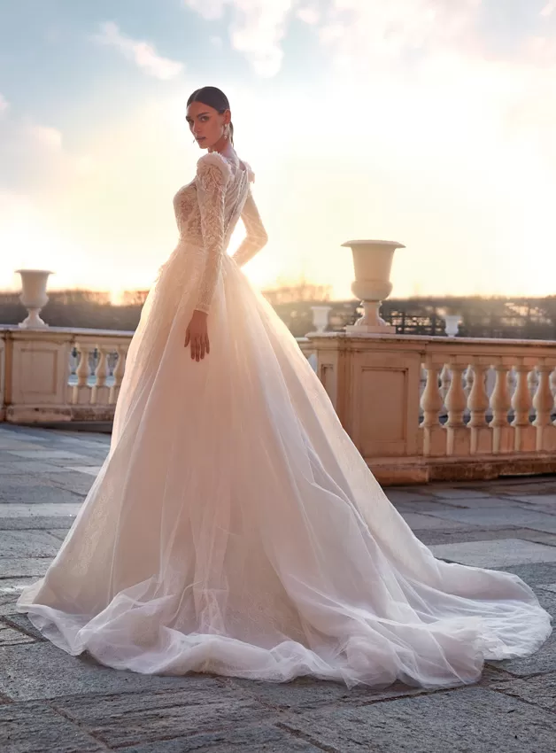 Uno spettacolare abito stile sirena che può essere trasformato in stile principessa con l'aggiunta di una sopragonna. Con ricami incredibilmente intricati sul corpetto e sulla parte superiore della gonna che definiscono i contorni del corpo. La scollatura è sostenuta da un inserto in tulle color nude e da coppe interne, mentre le spalle arricciate e le maniche lunghe aderenti creano un moderno look da sposa in stile rinascimentale.