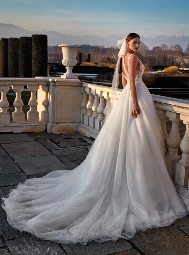 Un look nuziale mozzafiato in tulle scintillante e pregiato pizzo con un effetto volant intorno alla vita. Il ricamo testurizzato sul corpetto presenta un motivo geometrico che si arriccia sulla scollatura, sulle spalle e sulla schiena ed è evidenziato da splendide perline sulla fascia in vita.
