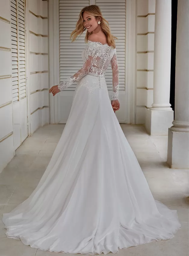 Sensuale abito con corpetto in pizzo e scollo a barca con spalle scoperte e maniche lunghe semitrasparenti. Un modello con gonna fluida in chiffon decorata da una cintura in guipure.