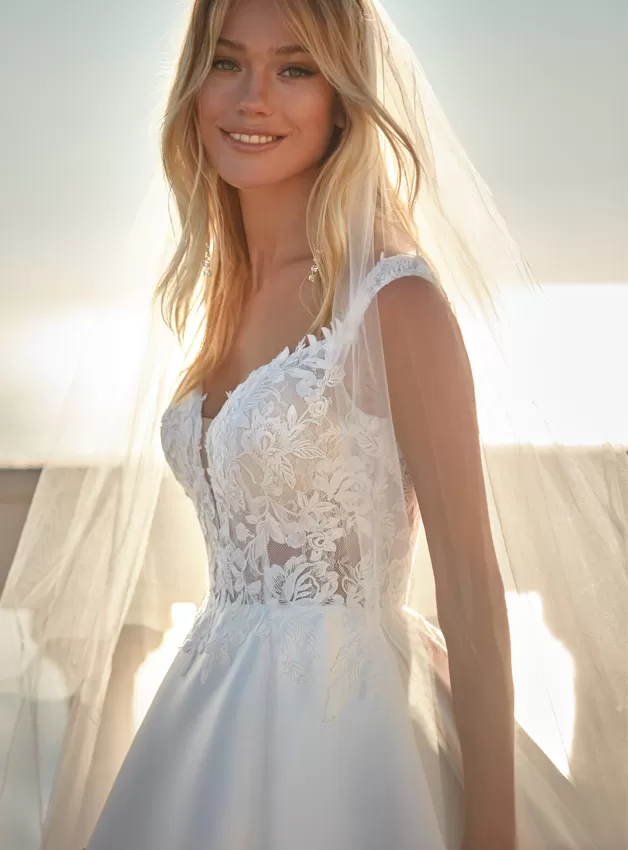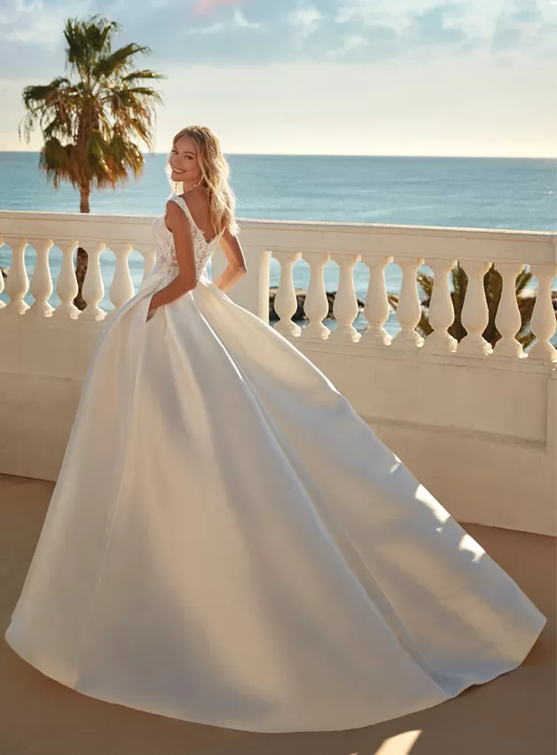 Abito sofisticato con gonna molto voluminosa in mikado con tasche e corpetto con applicazioni floreali in pizzo che delineano una scollatura a V in abbinamento con la schiena e spalline larghe.