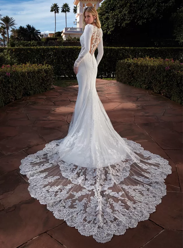 Spettacolare abito a sirena in crepe, con maniche lunghe, scollo a V, schiena semi-trasparente e corpetto con effetto cut-out. Un modello molto sensuale che gioca con il minimalismo del tessuto per abbinarlo con le applicazioni di pizzo e perline all-over fino allo strascico in tulle semitrasparente.