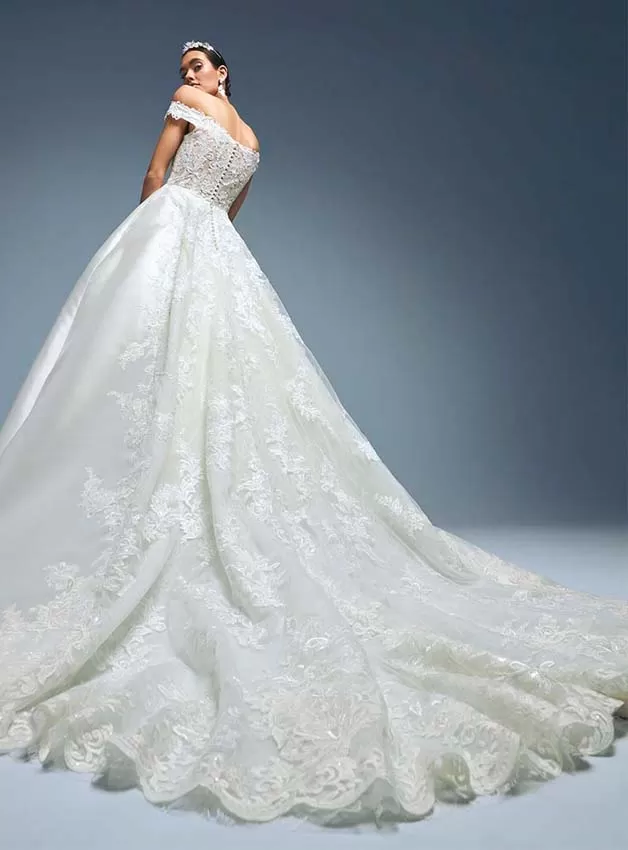 “Royal”. Un abito con volume, che sa combinare il classicismo del Mikado con il romanticismo del pizzo e i ricami in un disegno favoloso. Il minimalismo della gonna contrasta con il corpetto semitrasparente di pizzo e motivi floreali, che definiscono un bellissimo scollo off the shoulder.